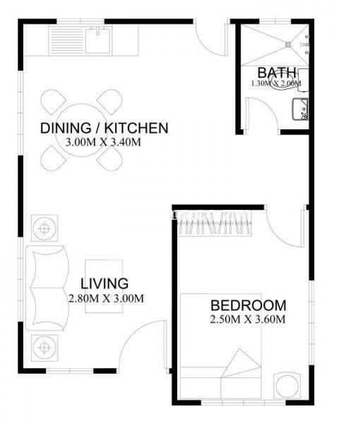 ctg 07 One bed cottage house plan with bath, toilet, shower, lounge, kitchen and living room. Open design, ideal for small families.
